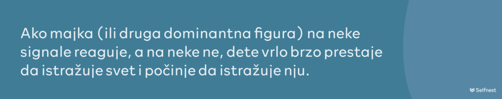 Dete stalno šalje signale. Plač, pogled, pokret, kasnije glas, sve su to pokušaji uspostavljanja kontakta. Međutim, ključ nije u samim signalima, već u odgovorima na njih. Ako majka (ili druga dominantna figura) na neke signale reaguje, a na neke ne, dete vrlo brzo prestaje da istražuje svet i počinje da istražuje nju. Ulaže sve svoje kapacitete u pokušaj da shvati: na koji signal će odgovoriti? Na osnovu toga dete uči koje delove sebe da pojača, a koje da potisne. Umesto da energiju koristi za igru, učenje i razvoj kognitivnih sposobnosti, dete je koristi za regulaciju odnosa. Ono ne menja odnos, vec sebe prilagođava odnosu. Upravo iz tog procesa nastaju obrasci afektivne vezanosti. Ne kao svesni izbori, već kao najbolja moguća prilagođavanja datim okolnostima.