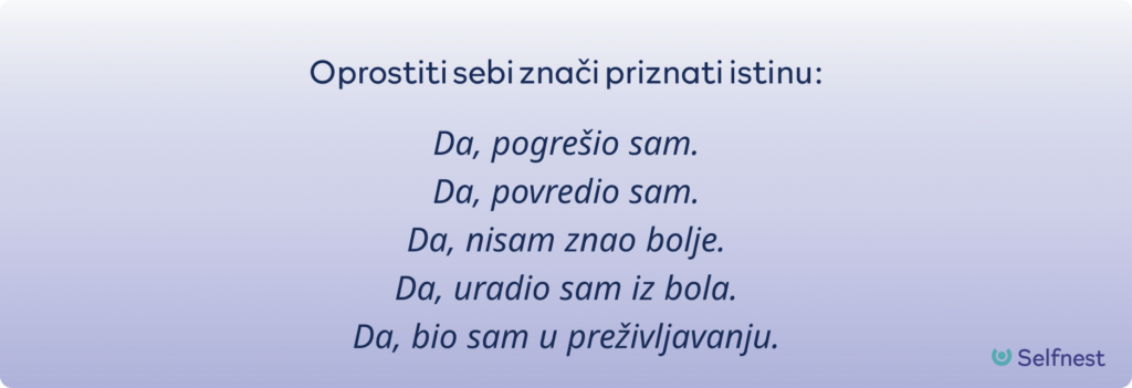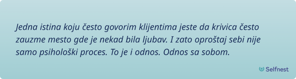 Zato što oproštaj sebi nije samo odluka. Oprostiti sebi znači prestati sa samokažnjavanjem, dokazivanjem svoje vrednosti, vraćanjem u prošlost kako bismo kinjili sebe što nismo uradili ovo ili ono. Oprostiti sebi znači reći: “Bilo je strašno. Ja i dalje zaslužujem da živim.” Oprostiti sebi znači preuzeti odgovornost.