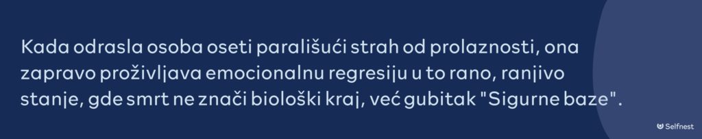 Kada nas preplavi egzistencijalni užas, to najčešće reaguje naše Dete. Za malo dete, pojam “zauvek” i “nikada” je kognitivno neshvatljiv, ali je osećaj napuštanja bolno stvaran. Za naše unutrašnje Dete, smrt je vrhunsko napuštanje. To je onaj arhaični strah da ćemo ostati sami u mraku, bez zaštite i bez glasa onih koji nas vole.